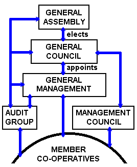 The General Council is the Sector's higher management made up of between two and four members of the Boards of Directors of the members co-operatives. The General Management: Its function is to predict, plan and stimulate the co-ordinated harmonious joint development of the co-operatives in the Sector. The Audit Group: Also called the Account Control Board, they are charged with examining accounts as they deem necessary, alerting the Management of problems and obtaining information for the membership. The Management Council is an advisory body to the General Management. It consists of the Director General, the Management of the member Co-ops the Central Services manager and anyone else who may be useful in helping the Council. Note on Finance: The member co-ops have to meet the budget quota drawn up in the annual Management plan. |