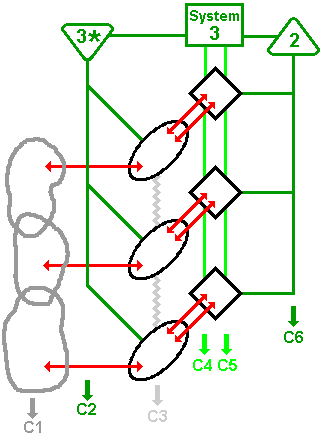 System 3 is shown with its two subsystems: System 3* responsible for audits and surveys, and System 2 responsible for stability. The diagram also illustrates 6 vertical channels which interconnect the various aspects of the Operational elements: C1: Environmental intersects. C2: Audits and surveys (System 3*). C3: Operational interactions. C4: Mandatory System 3 information. C5: Negotiated System 3 information. C6: System 2 (stability) information.