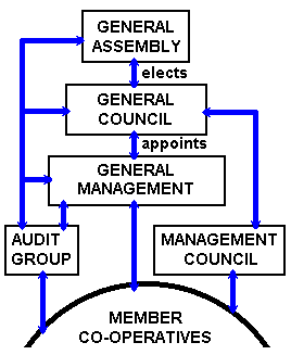 System 5: PolicyPolicy is determined by a General Assembly and is described as "The Will of the Members."Throughout Mondragon, attempts are made to involve the maximum number of members at the policy level. Currently the entire group is debating the wage differentials and the decision will be made at a meeting of over 1,000 people. At the Sector level, the General Assembly is composed of the members who are on the Board of Directors of every co-op in the Sector together with the Audit groups and the Managers. Their tasks are described as "to approve the Groups general policy, approve the budget, and to modify organisational rules" The Eroski group consists of both the 1928 worker members who run the shops and warehouses and the 152,000 consumer members. In this case the General Assembly is composed of 250 delegates from worker-members and 250 delegates from the consumers. In order to ensure everyone is informed of the issues, there are five preliminary meeting before the General Assembly. The large number of notice boards throughout the factories that I visited, together with the interest that was shown in issues at all levels (currently wage differentials and restructuring to emphasise the Sectoral rather than the Regional groupings) indicated that everyone has an interest in policy at all levels and the means to express themselves.